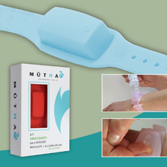 EL BRAZALETE MŪTHA ESTÁ HECHO EN SILICONA Y POSÉE UN MÉTODO DE RECARGA FÁCIL INSERTANDO EL APLICADOR EN EL ORIFICIO DEL RECEPTÁCULO Y PRESIONANDO EL ENVASE DE ALCOHOL SE PRODUCE EL LLENADO.